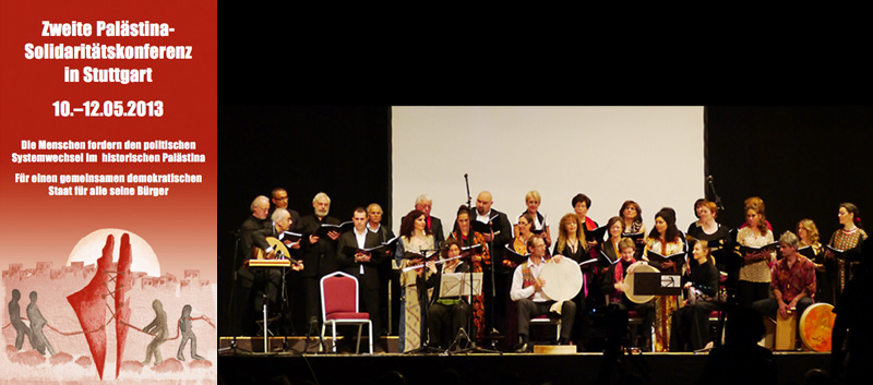 Politik würde mittlerweile nur noch als Verhaftungen, Unterdrückung und Korruption verstanden. Unter der Bevölkerung hat sich Resignation verbreitet, viele Leute sind in sich gekehrt und viele Familien sind zerstritten. Im Westjordanland sei eine neue Härte zu beobachten. Brutale Auflösung von Demonstrationen und Inhaftierungen sind alltäglich. Die PA (palästinensische Autonomiebehörde) ist zur Kooperation mit der israelischen Besatzungsmacht gezwungen. Die Behörde - inzwischen ohne jegliche demokratische Legitimität - verteidigt dabei ihre Privilegien auf Kosten der breiteren Bevölkerung. Im Gazastreifen und im Westjordanland bekämpfen sich Fatah und Hamas mehr als dass sie kooperieren und es gibt derzeit kaum eine nennenswerte linke Bewegung. Die Wirtschaft der besetzten Gebiete ist von Spenden der westlichen Geberländer abhängig. Die Besatzung mit ihren täglichen Schikanen und ihrer Unterdrückung macht eine Annäherung praktisch unmöglich, doch die israelische Regierung denkt sie hätte alles in Griff und sieht keinen Grund die Dinge zu ändern. Dennoch bleibt Baumgarten optimistisch, denn sie sieht die Situation in Israel und in den besetzten Gebieten als langfristig unhaltbar. Die Zweistaaten-Lösung hält sie inzwischen auch für illusorisch. Um einen dauerhaften Frieden zu erreichen, werden die Menschen dazu gezwungen sein, miteinander zu leben, wenn auch Toleranz derzeit nicht weit verbreitet sei. Das Beharren in Israel auf einer jüdischen Nationalität, die erst neulich vom höchsten Gericht bestätigt wurde, verankert Rassismus und Exklusivität nur für einen Teil der Bevölkerung und ein zunehmendes rassistisches Denken verbreite sich in Israel insbesondere unter Jugendlichen, die eine Sozialisation erfahren, die ein solches Denken fördert. Deswegen sei es notwendig, so Baumgarten, sowohl Druck auf diejenigen Länder auszuüben, die Einfluss auf Israel haben, als auch auf Israel selbst. Die Signale (z.B. europäische Gesetze gegen das Importieren falsch etikettierter Produkte aus Siedlungen und Forschungsgelder für Projekte in Siedlungen) die vom europäischen Parlament kommen seien richtig, aber längst nicht aussreichend. Darum unterstützt auch sie die BDS-Kampagne (Boykott, Desinvestitionen und Sanktionen), die von der palästinensischen Zivilgesellschaft 2005 angestossen wurde, denn Palästina sei im Notstand und brauche unser aller Engagement. bds-info.ch Veranstalter: Palästinakomitee Stuttgart e.V. und pax christi - Diözese Rottenburg-Stuttgart 10. bis 12.05.2013: Zweite Palästina-Solidaritätskonferenz in StuttgartMehr als 300 TeilnehmerInnen, viele aus dem Ausland, sind vom 10. bis 12. Mai 2013 zur zweiten Palästinakonferenz in Stuttgart zusammengekommen, um die Meinungen und Analysen hochkarätiger Referenten zu hören und mit ihnen zu debattieren.