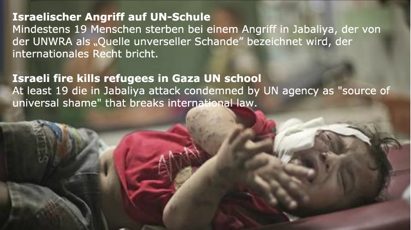 Now, more than 2,500 civilians in Gaza, including of course old people, women and children, have been killed since the start of the Israeli offensive. Hundreds of high rise buildings have been destroyed: entire families have been wiped out. This action amounts to a war crime against 2.2 million people living in a prison camp with no water, no electric power and no way out.